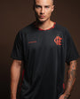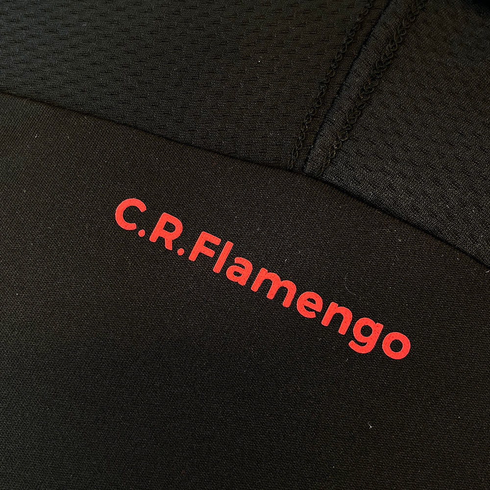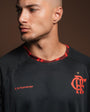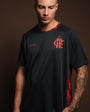 Hello, Nation! Flamengo men's raglan t-shirt in a mix of Dry Max and Sport Dry fabrics that absorb and wick away sweat, ensuring better breathability. The garment features textured sleeves, a collar, and side stripes with an exclusive zero-touch digital print and a prominent CRF logo, perfect for casual wear and going to the stadium.