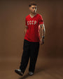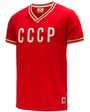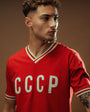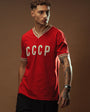 The model proudly displays his support for the CCCP national team. The shirt is made from retro-style cotton, offering a soft, lightweight, and comfortable feel.